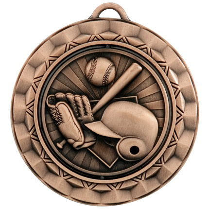 Our Spin Medal Series award features some intricate design patterns, and the best of the lot is the one in the center that looks like a spinning wheel. This interesting pattern forms a perfect background for the baseball diamond and a ball, bat, helmet, and an intricately designed baseball glove. The 3D pattern on the outer border looks amazing, and the intricately carved “V” design pattern on the inner border is even better. The best part is that you get all those intricacies and design brilliance at a very affordable price.