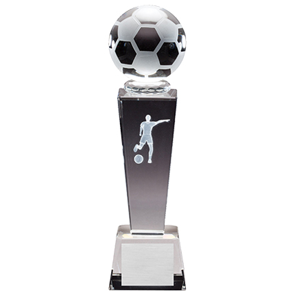 Looking for a premium award for the college soccer championship? This crystal trophy with a black and white soccer ball on top makes a perfect choice. It has a nice and simple shape while the presence of a soccer ball in the design designates it for the soccer champs. It also has a soccer player imprinted on the front as he gets ready to strike. It’s elegant, sleek, and stylish!