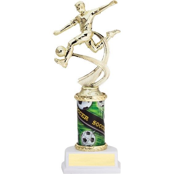 This fully assembled soccer trophy shows soccer in motion. At 10" (including its synthetic base), this trophy is the perfect award to honor the entire team.
