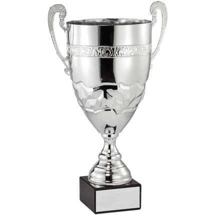 Our DTC55 SERIES - FULL-METAL CUP features a silver, metal cup. The trophy is mounted on a solid foundation with an engraving plate. Your athletes will like delicately engraved details on the body of the cup. Our trained artists use laser technology for engraving. We offer three sizes and personalization options. It will be an ultimate reward for your players. Its handles are beautifully designed to complement the design of this trophy.