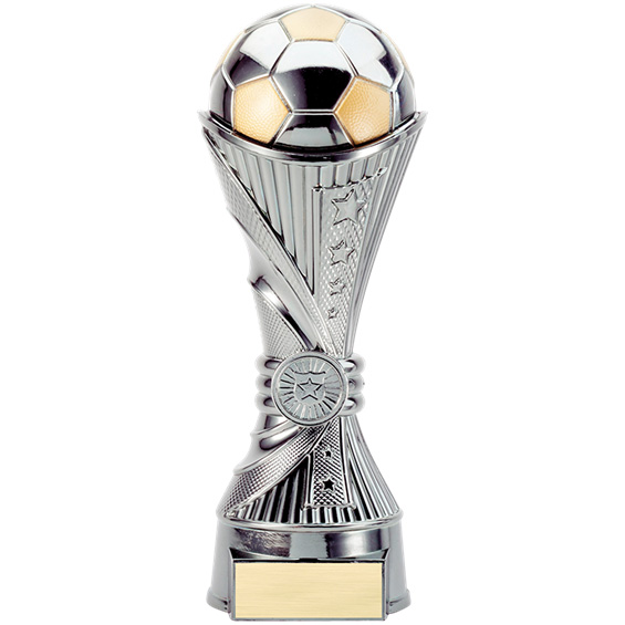 The elegant soccer trophy is a classic silver in a shape that resembles one of soccer’s most famous trophies. A silver and gold soccer ball sits at the top of this timeless trophy.