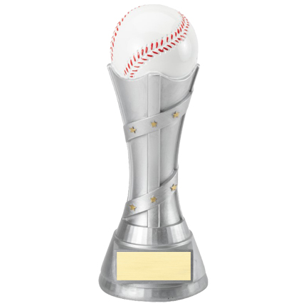 Sleek, modern, and stylish, this resin baseball trophy is a sight to behold! Finished in a polished silver tone, the trophy has been adorned with small golden stars etched carefully from top to bottom. The clean lines and upward-sweeping design evoke a sense of aspiration and victory. The highlight of this creative masterpiece is the big white baseball with red stitching that rests on the top. The trophy sits on a beautiful Alamar base with a golden engraving plate for your custom engravings.