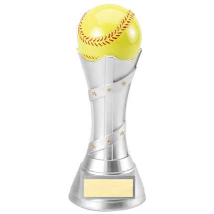 Sleek, tall, and handsome, this resin softball award is a contemporary masterpiece tailored perfectly for the tournament champions. Its modern design boasts a beautiful silver column adorned with striking details etched to precision. The beautiful gold star accents spiral around the silver column and add a touch of elegance to this stunning trophy. The big yellow softball at the top lends this piece an authentic feel, making it a perfect display item ideal for commemorating athletic excellence on the diamond.